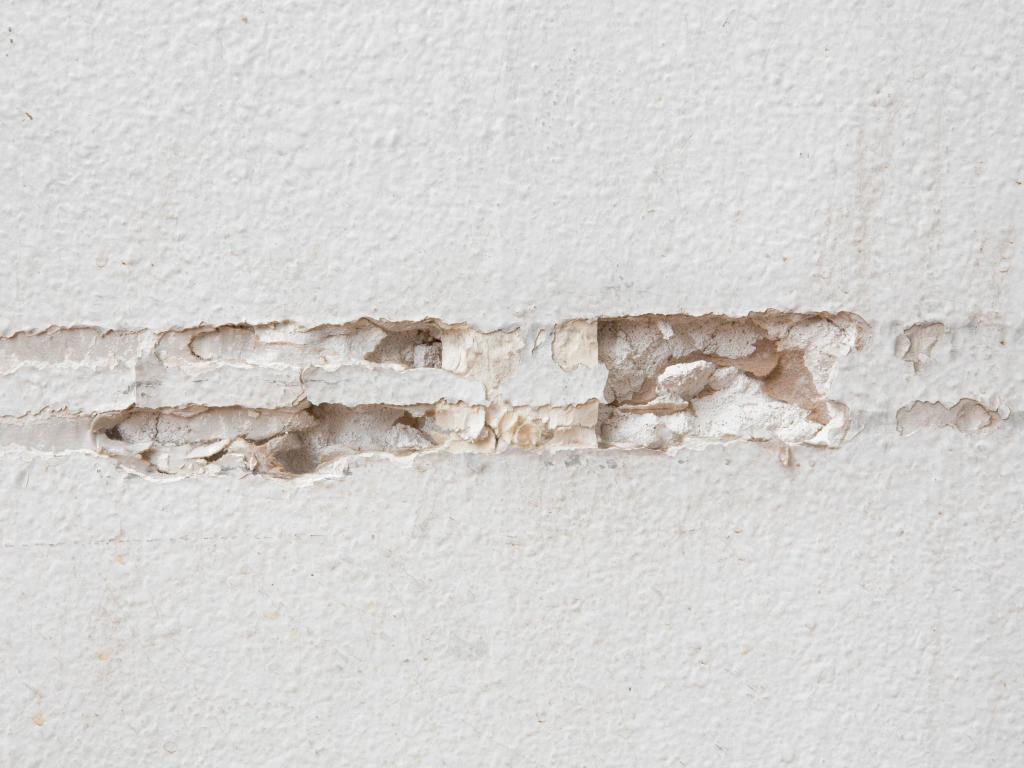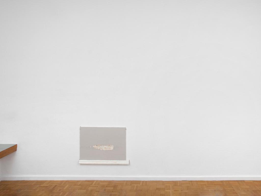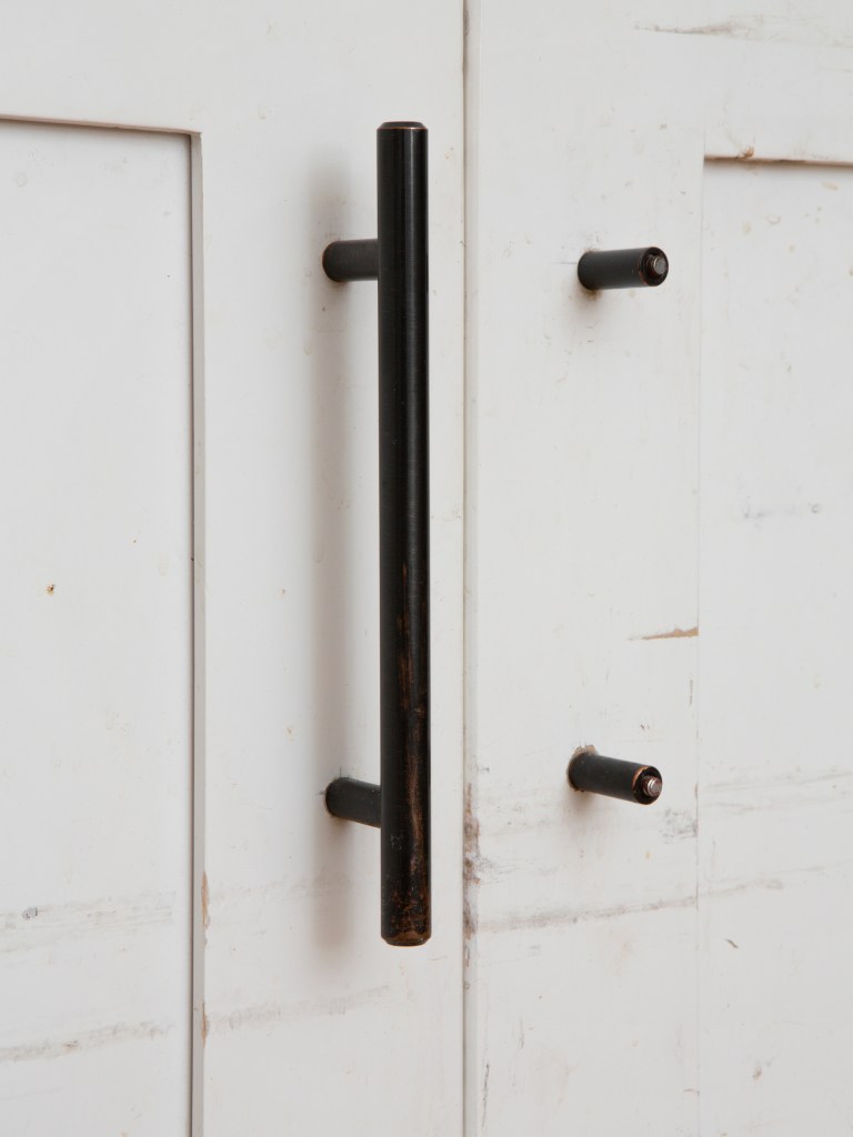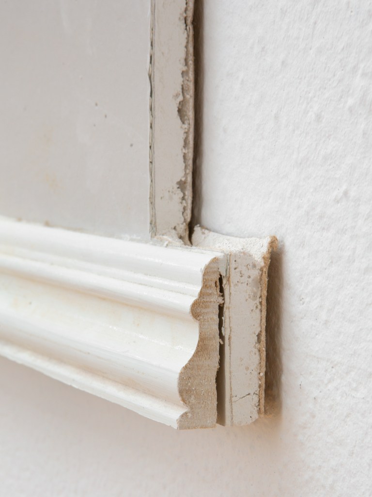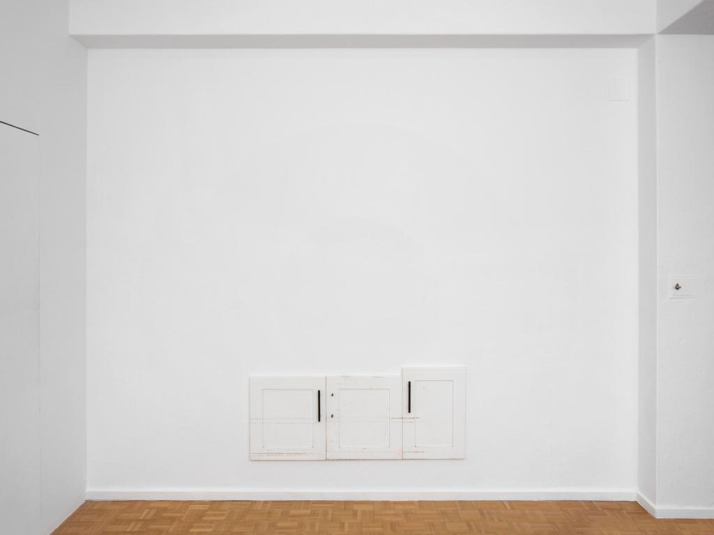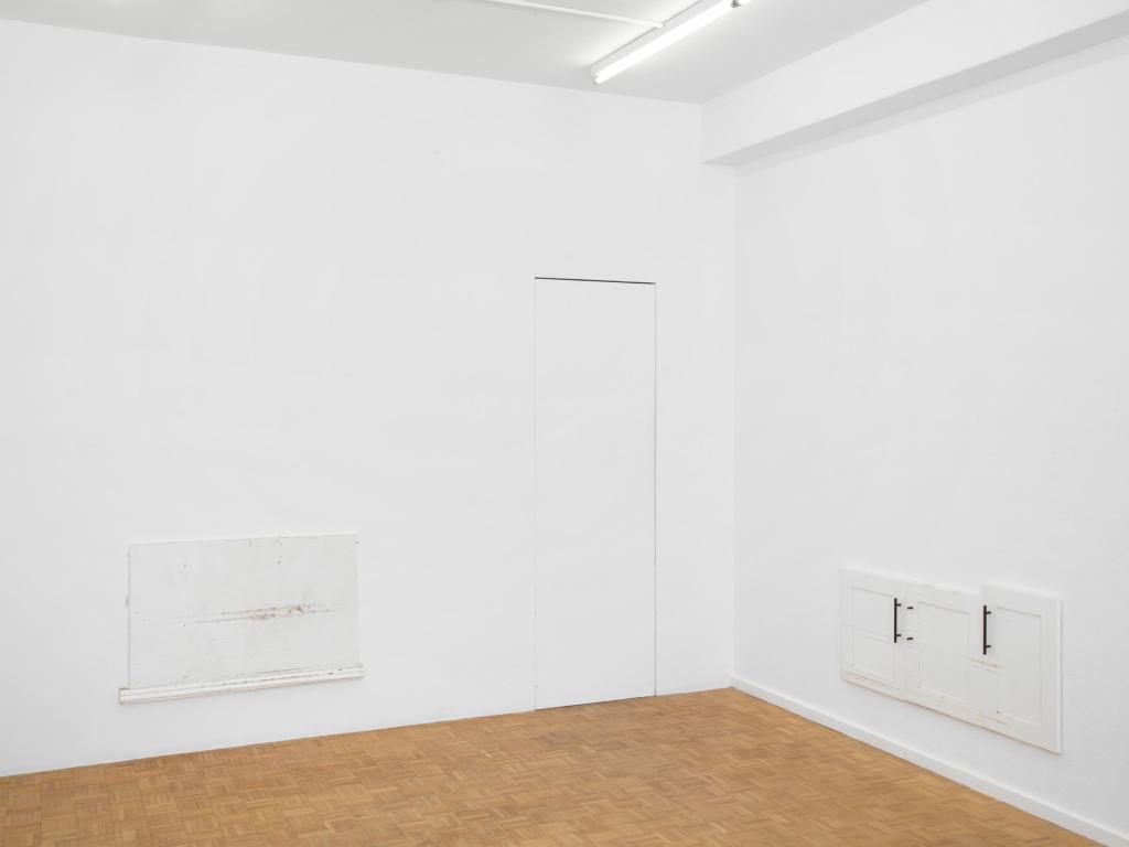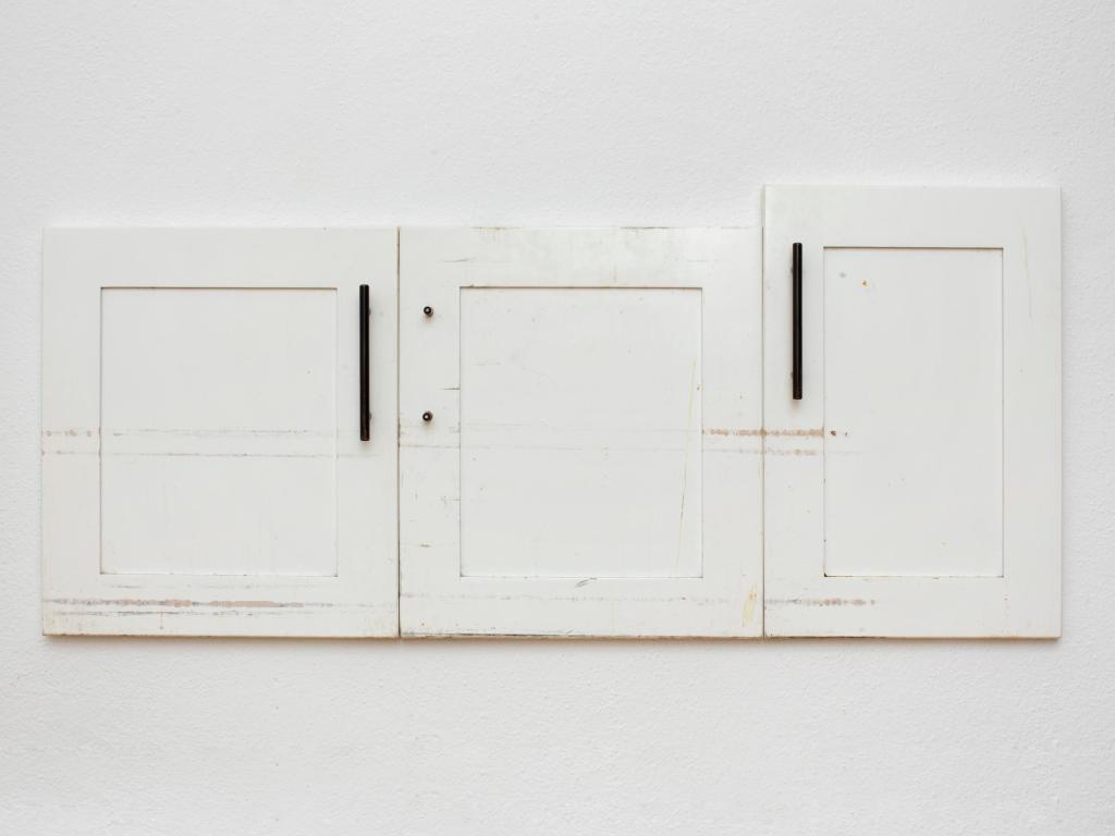 Bed frame (next to the window) 2023 – wood, paint, and metalKitchen cabinet doors (under the sink) 2023 – wood, paint, plastic and metalBedroom wall (under the window) 2023 – drywall and woodEmily Barker, Bathroom wall (across from the sink) 2023 – drywall and wood
